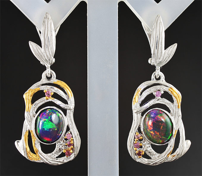 Серебряные серьги с кристаллическими черными опалами и родолитами