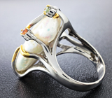 Серебряное кольцо с жемчужиной барокко, зеленым и оранжевым сапфирами