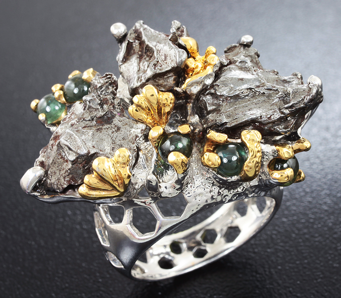 Серебряное кольцо с осколками метеорита Кампо-дель-Сьело и зелеными сапфирами
