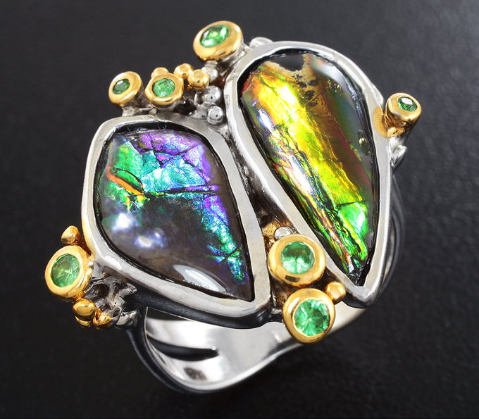 Серебряное кольцо с аммолитом аммонита и цаворитами