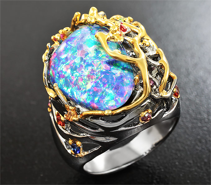 Серебряное кольцо с австралийским триплет опалом, разноцветными сапфирами и цаворитами