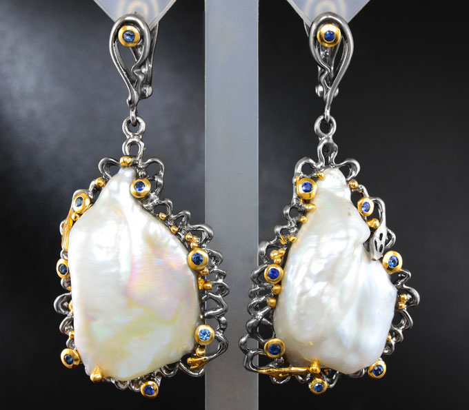 Серебряные серьги с жемчугом барокко и синими сапфирами