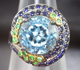 Серебряное кольцо с голубым топазом, цаворитами и синими сапфирами