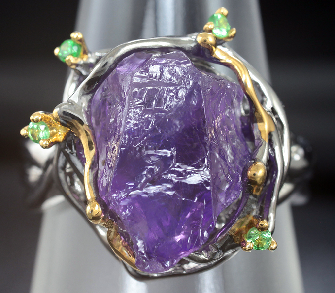 Серебряное кольцо с необработанным аметистом и цаворитами