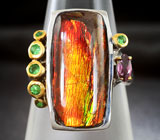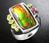 Серебряное кольцо с аммолитом аммонита, родолитом и цаворитами