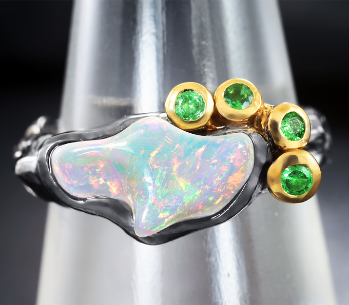 Серебряное кольцо с кристаллическим эфиопским опалом и цаворитами