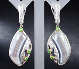 Серебряные серьги с агатом 21,84 карата и цаворитами