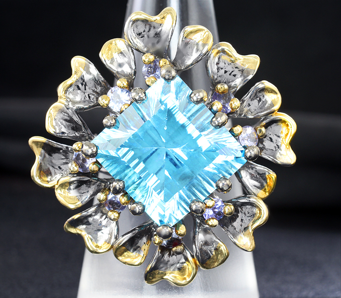 Серебряное кольцо с голубым топазом лазерной огранки 14,5 карата и васильковыми сапфирами