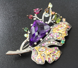 Серебряная брошь с уругвайским аметистом 12,27 карата, родолитами, турмалинами, сапфирами и изумрудом