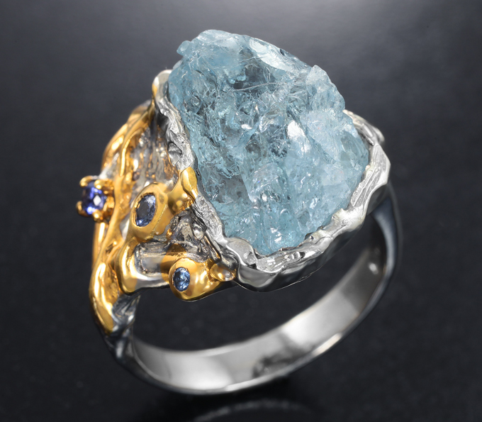 Серебряное кольцо с грубообработанным аквамарином 9,7 карата и синими сапфирами