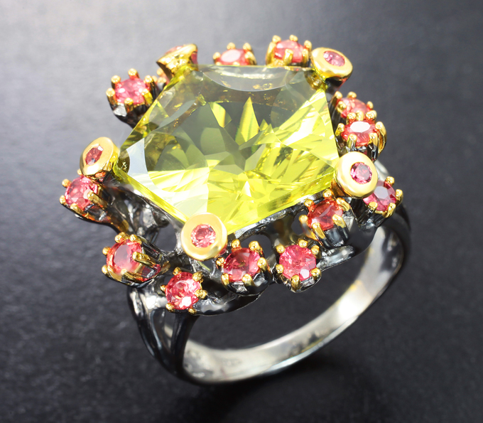 Серебряное кольцо с лимонным цитрином лазерной огранки 8,65 карата и розовыми сапфирами