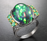 Серебряное кольцо с кристаллическим черным опалом 8,07 карата и изумрудами