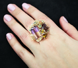 Лот № ex-2262 Золотое кольцо с самоцветами и бриллиантами! Материал: Золото Вес изделия: 25,1 грамм Размер: 18 (Не подходит размер?) Вашему вниманию предлагается кольцо из желтого золота 585 пробы с аметринами, сфенами массой 1,3 карат, цаворитами гранатами, сапфирами, аметистом, танзанитом и 6 бриллиантами! Диаметр дополнительной инкрустации от 1 мм до 6 мм. Площадка 32 х 31 мм, высота 14 мм. Вес изделия 25,1 г. Размер 18. Ниже приводятся ювелирные характеристики аметринов.